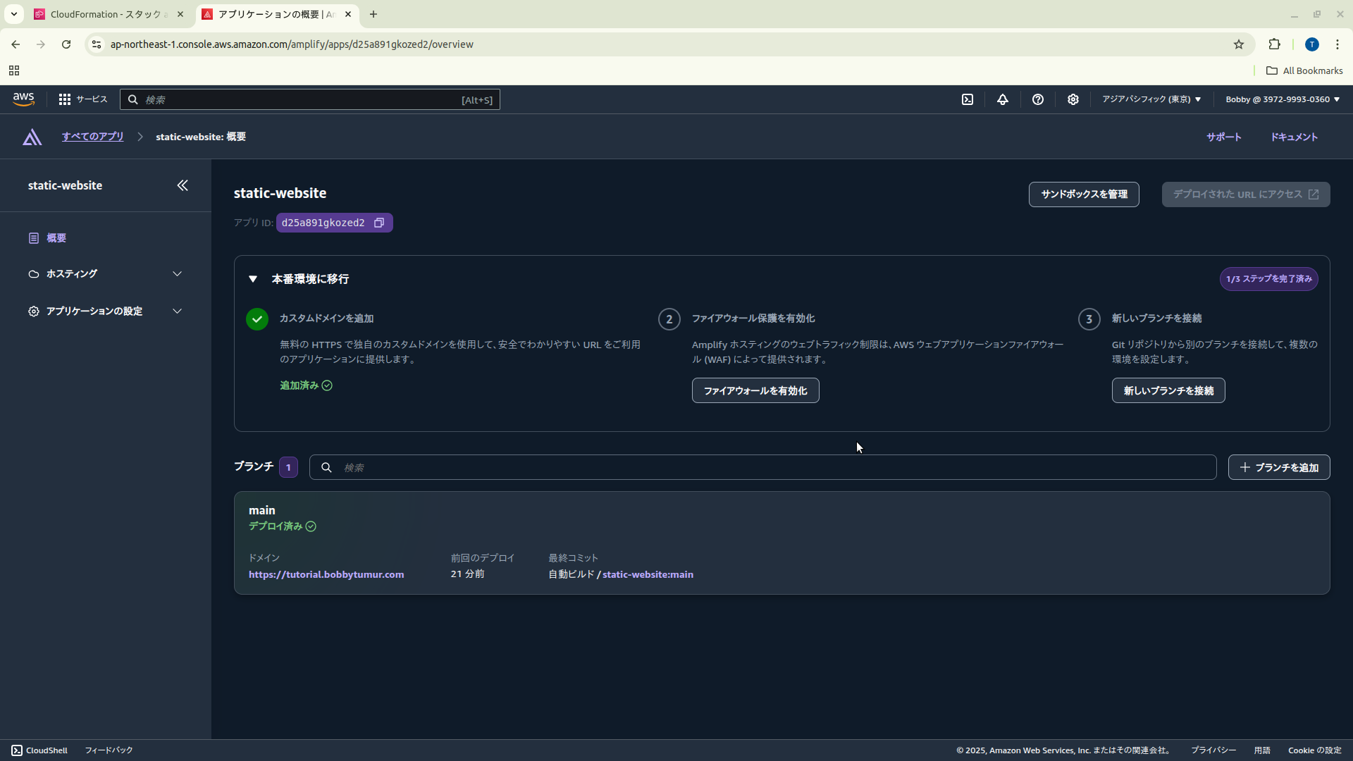 AmplifyDomain— カスタムドメインの設定AmplifyDomain: Type: AWS::Amplify::Domain Properties: AppId: !GetAtt MyAmplifyApp.AppId DomainName: yourdomain.com SubDomainSettings: - Prefix: tutorial BranchName: maintutorial.yourdomain.comをmainブランチに割り当てます。- これにより、
