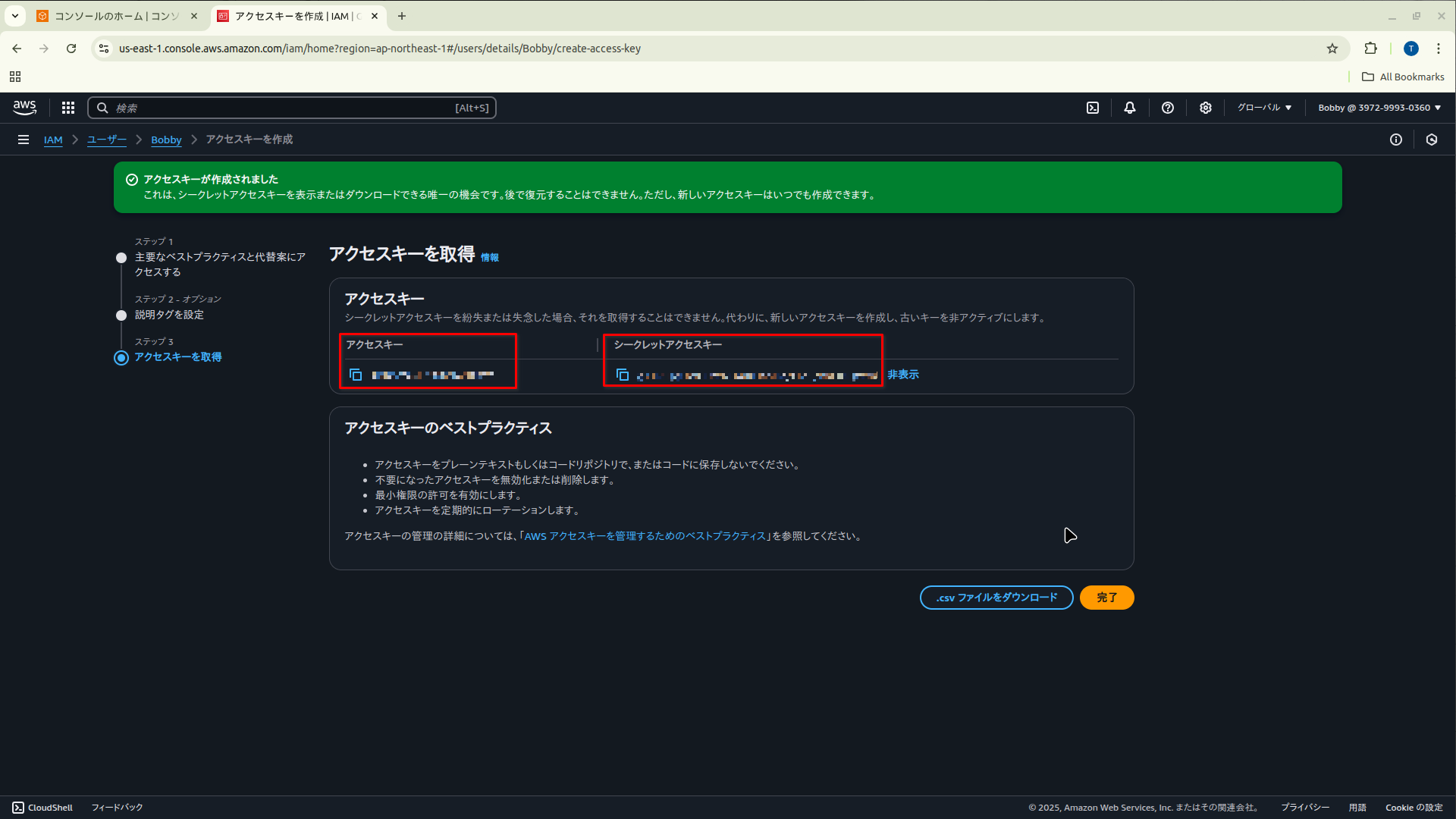 上記のシークレットアクセスキーが再生できないため、.csvファイルをダウンロードボタンで安全な場所に