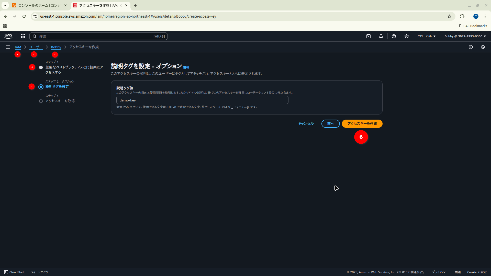AWS IAM にてアクセスキーを作成し、取得をします。