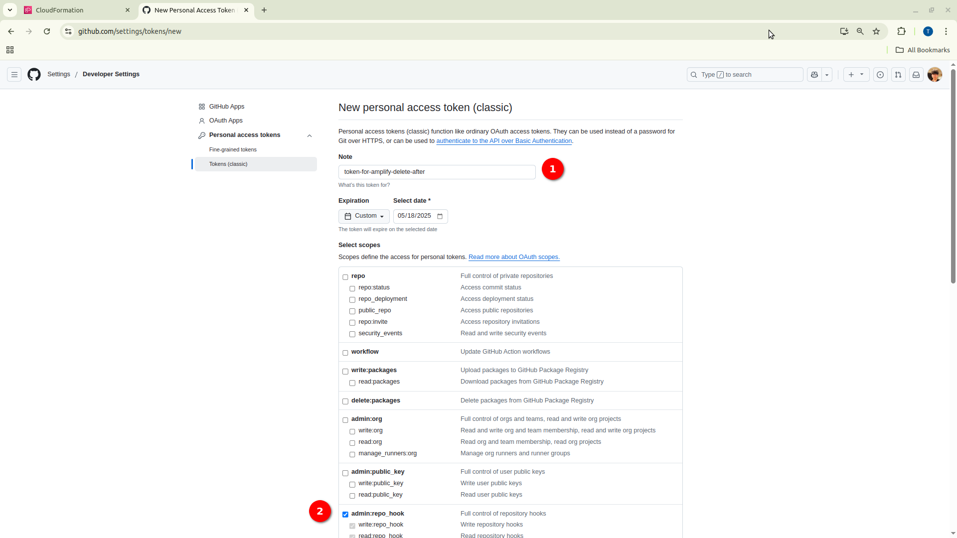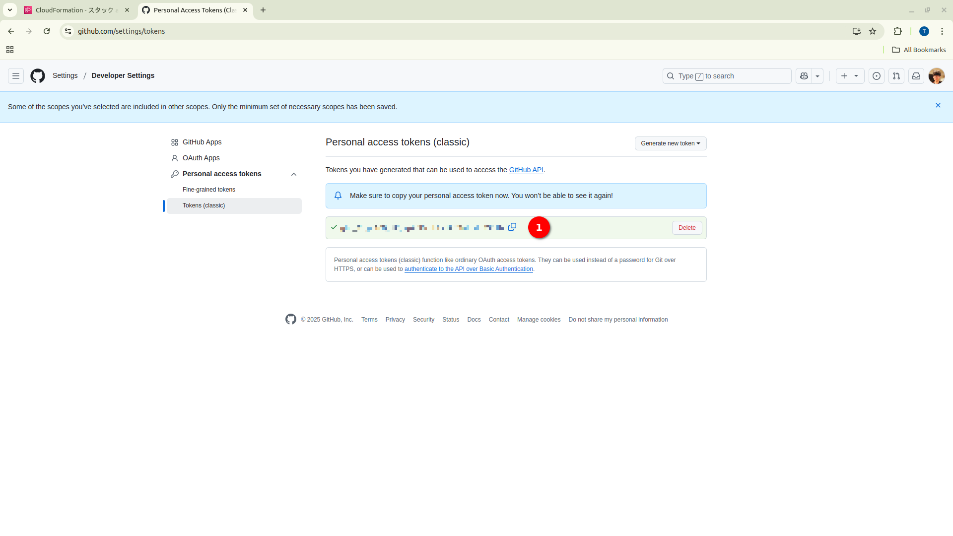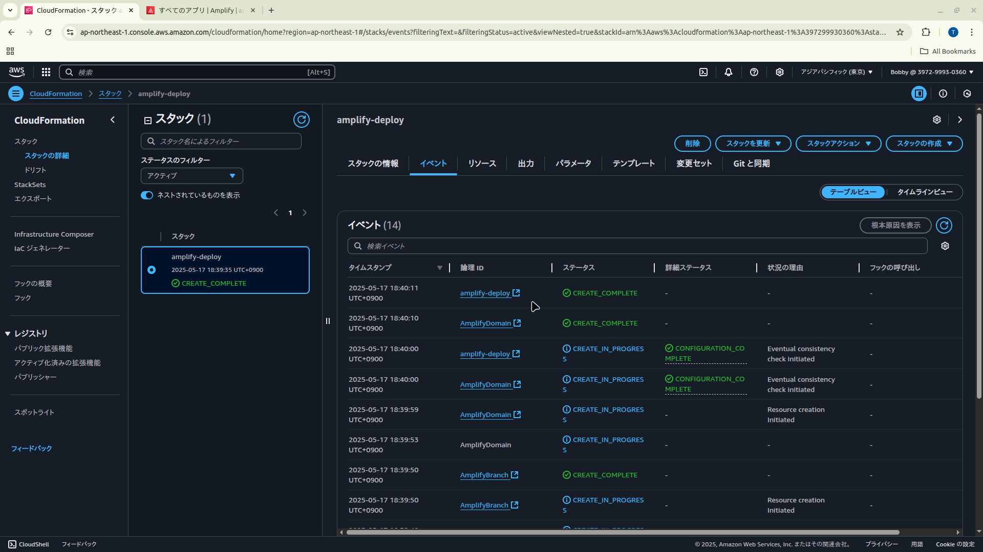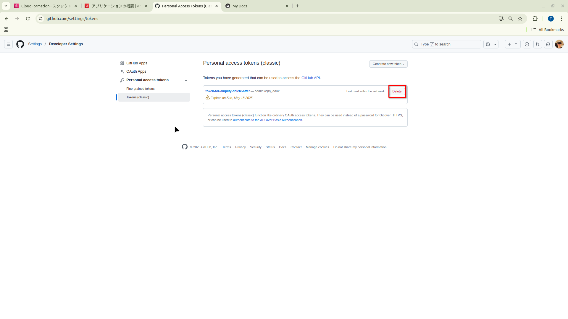 上記において、Amplify **がリポジトリへアクセスできるよう、GitHub** にて Amplify App をインストールしました。 また、そのアクセスのための認証情報として PAT (Personal Access Token) を発行・ダウンロードしました。 この PAT を CloudFormation テンプレートに含めることで、CloudFormation によってスタックおよび Amplify アプリを正常に作成・実行することができました。