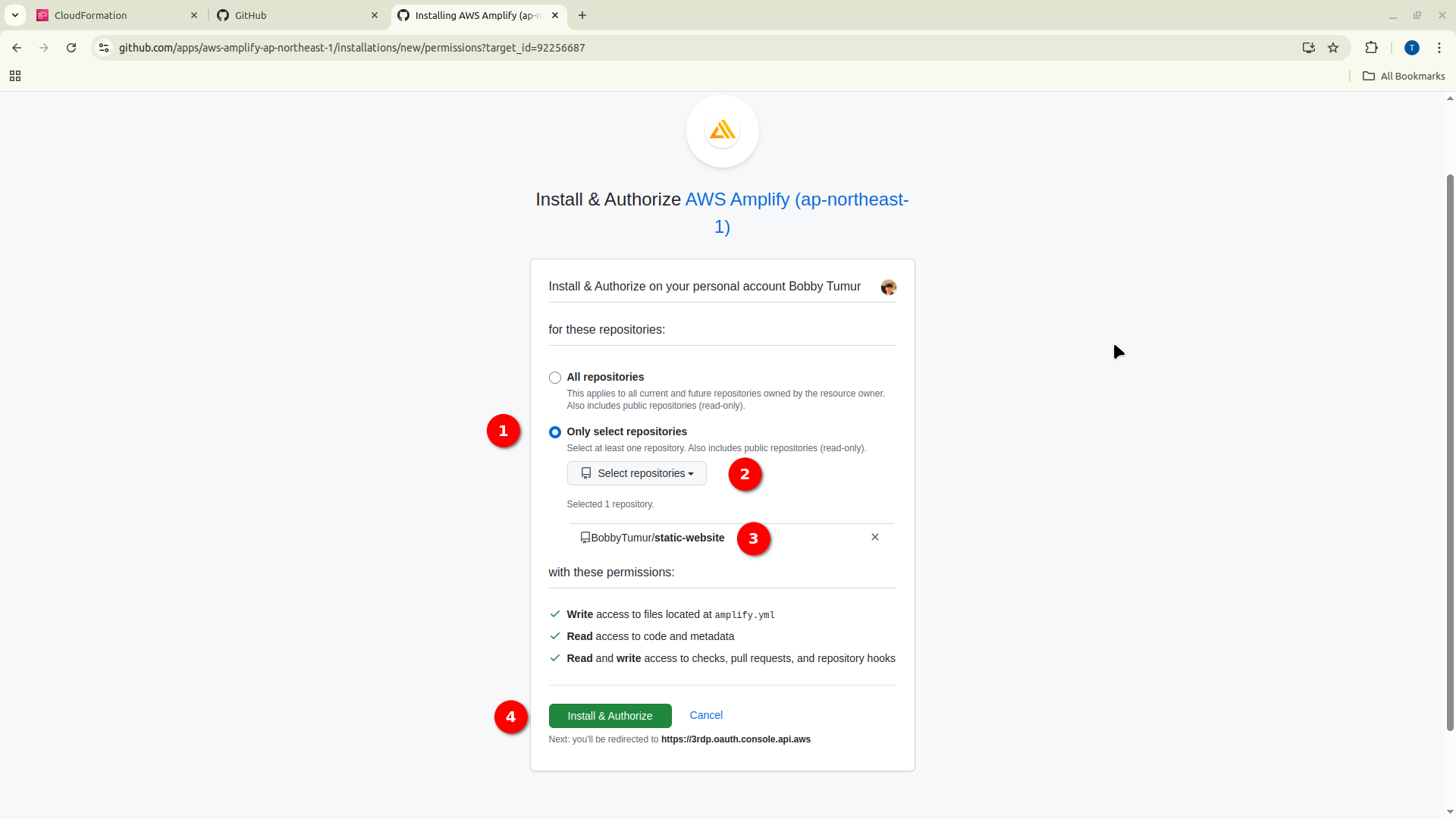 https://github.com/apps/aws-amplify-ap-northeast-1へアクセスし、