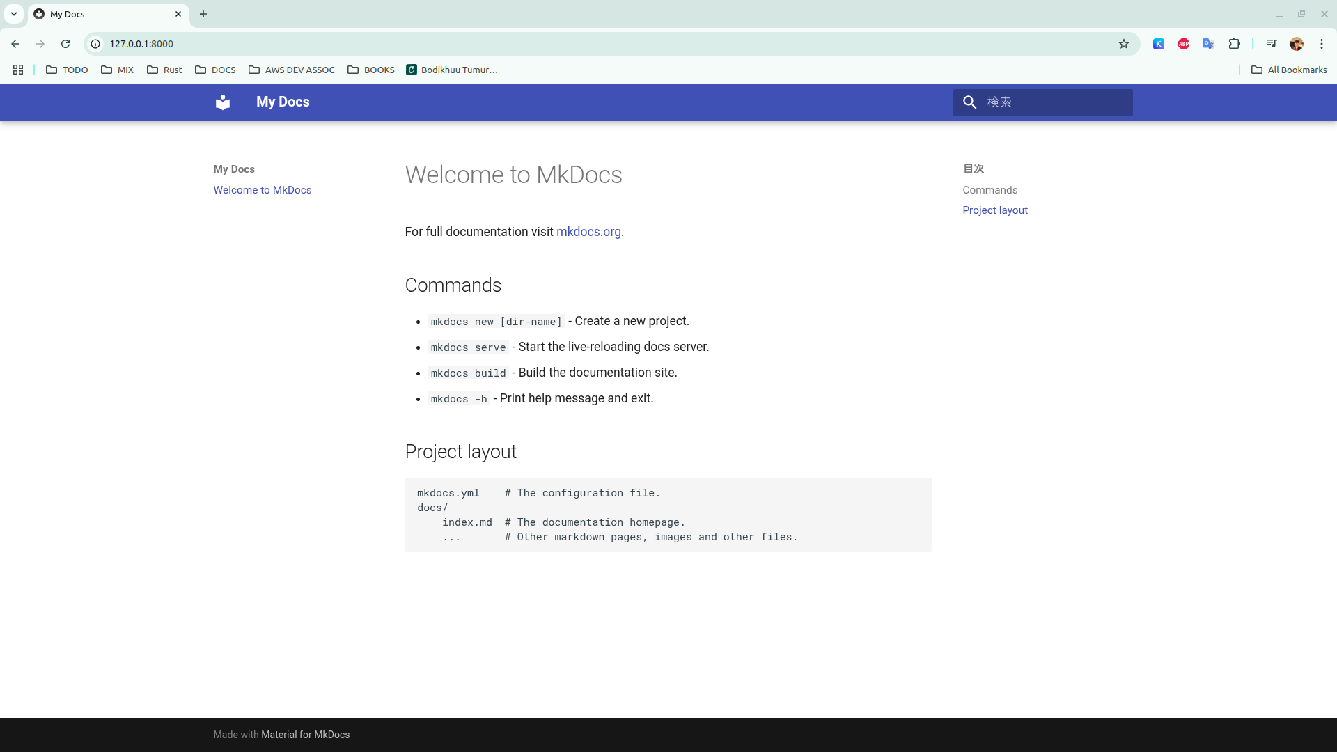 (.venv) $ mkdocs new . INFO - Writing config file: ./mkdocs.yml INFO - Writing initial docs: ./docs/index.md (.venv) $ cat >> mkdocs.yml # (1)! theme: language: ja name: material (.venv) $ mkdocs serve INFO - Building documentation... INFO - Cleaning site directory INFO - Documentation built in 0.29 seconds INFO - [23:43:12] Watching paths for changes: 'docs', 'mkdocs.yml' INFO - [23:43:12] Serving on http://127.0.0.1:8000/- このラインだけ実行し、以下の3ラインをコピペして